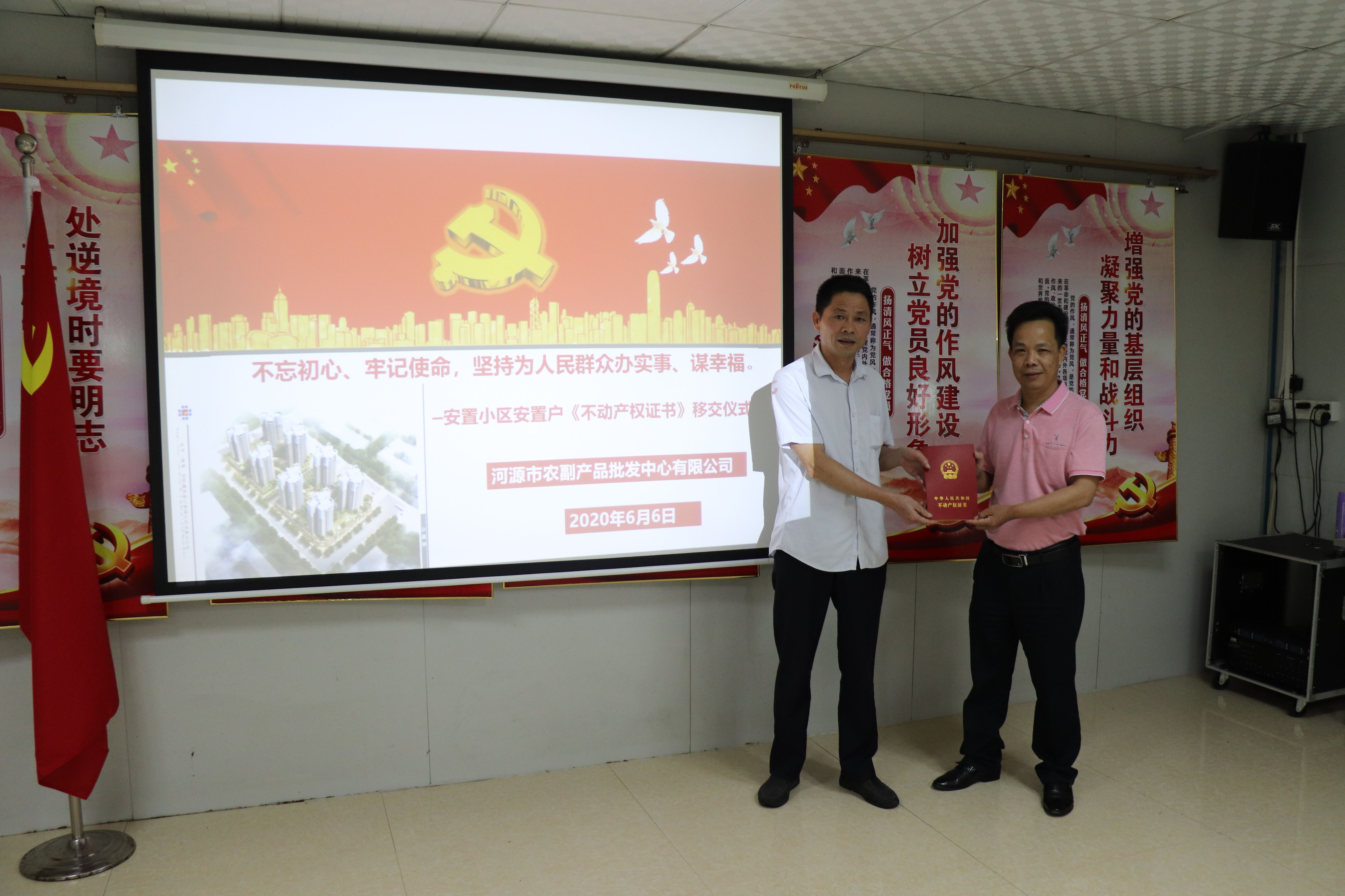 6月6日,農(nóng)批公司在項(xiàng)目指揮部會(huì)議室舉辦安置小區(qū)安置戶《不動(dòng)產(chǎn)權(quán)證書(shū)》移交儀式,公司支部委員、副董事長(zhǎng)鐘軍賜同志為82戶安置戶移交《不動(dòng)產(chǎn)權(quán)證書(shū)》。